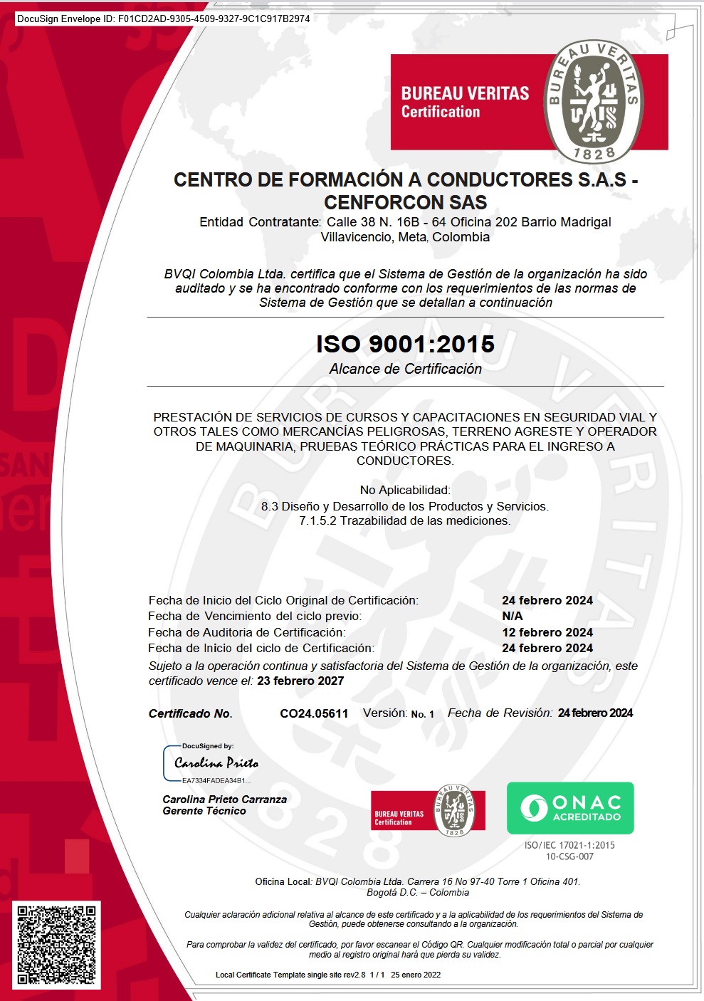 ¡Nos enorgullece presentar nuestro certificado de calidad ISO 9001:2015! En CENFORCON S.A.S., estamos comprometidos con la excelencia en la prestación de nuestros servicios de cursos y capacitaciones en seguridad vial, así como en otros campos como mercancías peligrosas, terreno agreste y operador de maquinaria. Este certificado, emitido por BVQI Colombia Ltda., valida nuestro Sistema de Gestión, que ha sido auditado y encontrado conforme con los rigurosos requerimientos de la norma ISO 9001:2015. Esta certificación demuestra nuestro compromiso con la calidad, la mejora continua y la satisfacción del cliente.